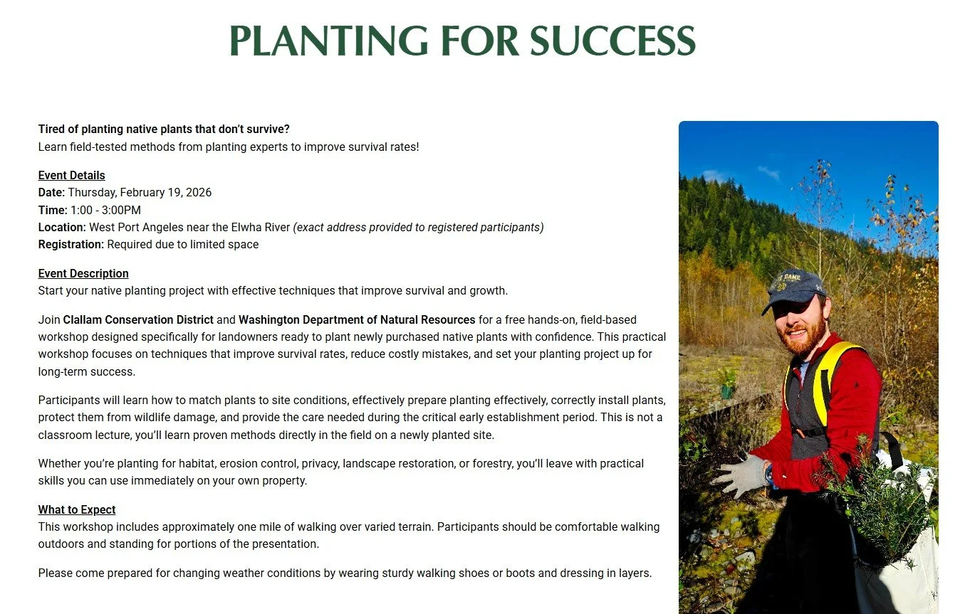 Two Natural Landscaping Courses will be offered again this spring, one for large lots and one for small lots. The large-lot course classes will be held in Port Hadlock and the small-lot classes will be in Port Townsend. The interactive three-class, two-field trip course emphasizes native plants and sustainable landscape design and maintenance practices.